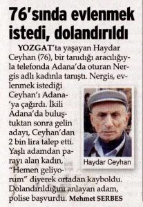 Telefon yoluyla tanıştığı kadınla evlenmek isteyen Haydar Ceyhan adlı vatandaş, kadının, kendisinden istediği 2 bin TL’yi alıp ortadan kaybolması üzerine şikâyetçi olmuş.